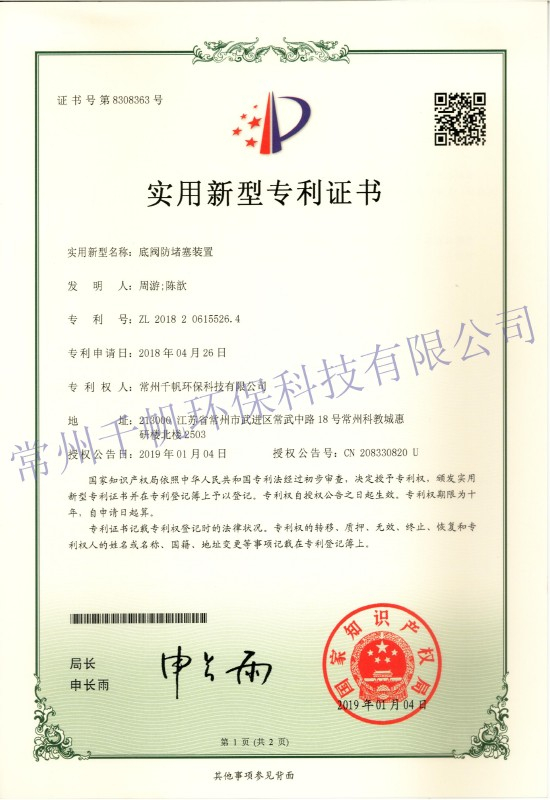 實用新型專利證書 污水處理設備生化系統噴淋消泡裝置
